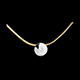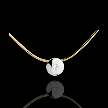 Een witgouden hanger draagt in het midden een diamant, opgehangen in het universum aan een gouden draad.