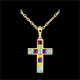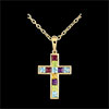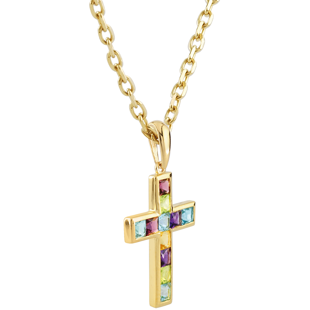 Een origineel en vrouwelijk kruis, versierd met citrien, amethist, peridoot, blauwe topaas en rhodoliet.