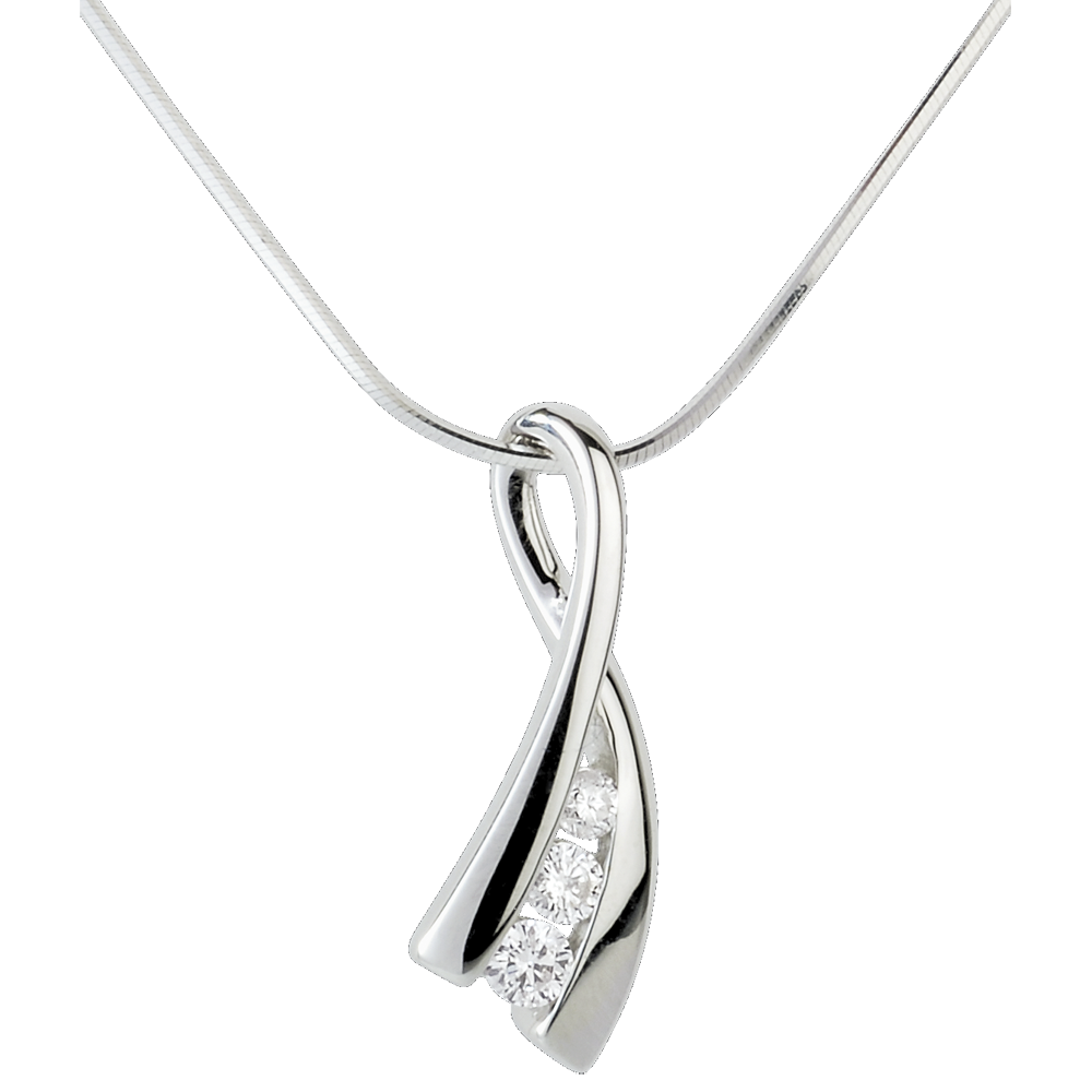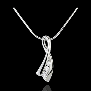 Een witgouden lint wordt geplaatst op een ketting om de illusie van een knoop met een trilogie van diamanten te geven.
