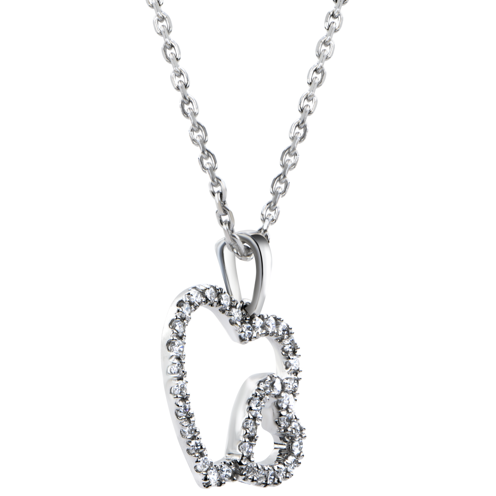 Het iconisch hart herwerkt in een dubbele versie voor deze must have, zachte en delicate ketting. Een opengewerkt model met bezette randen die er een modern en jong juweel van maken.