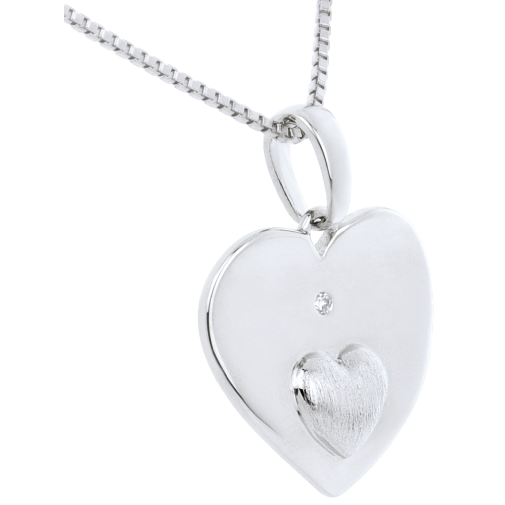 Een fijn golvend hart versierd met een diamant in het midden en een klein gebogen hartje in geborsteld witgoud.