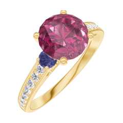 « L'ATELIER » Nº167866Ring Geelgoud 9 karaat - Robijn rond 1 Karaat - Aanleunende edelstenen Blauwe saffier - Setting Diamant 4.8 (14)