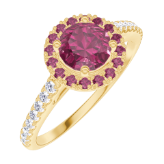 « L'ATELIER » Nº170310Ring Geelgoud 9 karaat - Robijn rond 0.5 Karaat - Halo Robijn - Setting Diamant 4.7 (18)