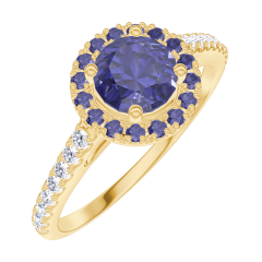 « L'ATELIER » Nº170614Ring Geelgoud 9 karaat - Blauwe saffier rond 0.5 Karaat - Halo Blauwe saffier - Setting Diamant 4.7 (18)