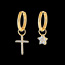 Een enkele geelgouden creole met een kruisvormige bedel en geplaveid met fonkelende diamanten. Afmetingen bedelring: 3.1 mm.