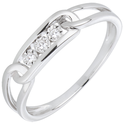 Drie diamanten gevangen op deze witgouden ring.