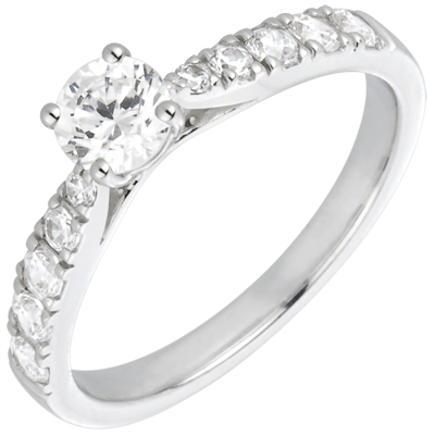 Een solitairee diamant, helder wit, is versierd met schitterende steeds groter wordende briljanten.