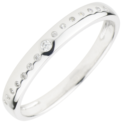 Een golf van diamanten ondersteund door witgoud met in het midden een diamant van 0.015 karaat.