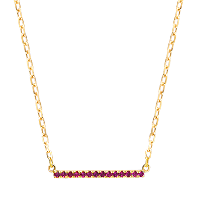 Een grafische lijn van veertien intens rode robijnen op een fijne geelgouden ketting.Een minimalistische maar krachtige ketting die het licht vangt als een vurige gloed.