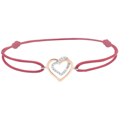 Een duo van harten in tedere en romantische krullen, in delicaat roségoud en witgoud, bezet met diamanten. Het motief is aangebracht op een modern rood koord.