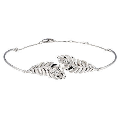 De Signature-armband in 9 karaats witgoud heeft een elegant veermotief, versierd met 8 synthetische diamanten. Fijn vervaardigd, sluit het ingesloten ontwerp met een discrete sluiting. Een stuk dat de luchtige essentie en ongeëvenaarde verfijning van veren vangt, het kenmerk van de Panache collectie.