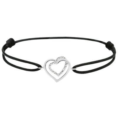 Een duo van harten in tedere en romantische krullen, combineert subtiel witgoud met diamanten. Het motief is gezet op een modern zwart koord. Motief 11,5 mm lang en 11,5 mm in de hoogte.