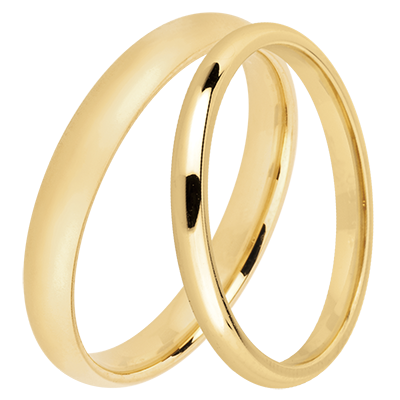 Een elegant paar klassieke trouwringen van geelgoud: 2 mm breed voor haar, 3 mm breed voor hem.