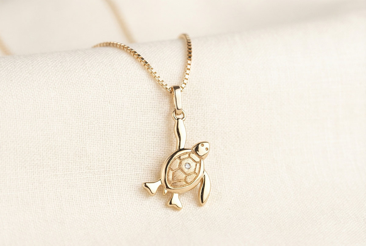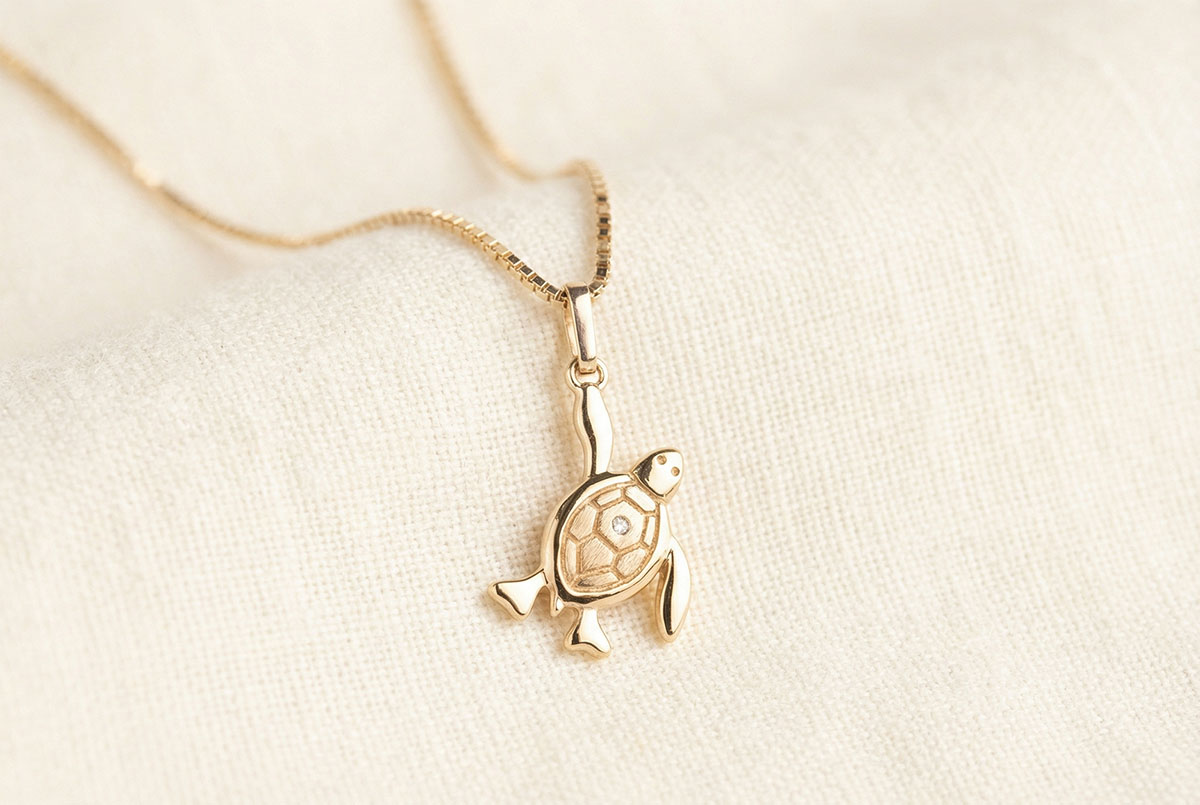 Een babyschildpad in actie overgelaten aan de zee. Zijn schelp is in geborsteld geelgoud en versierd met een diamant. Groot model.
