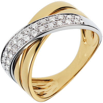 Een trio ellipsen in geel en witgoud geplaveid voor een trouwring met een perfecte harmonie.