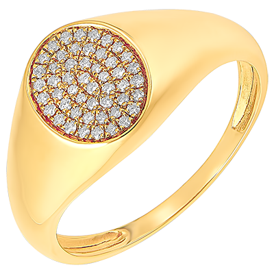 Een geelgouden zegelring waarvan de ovale plaat royaal bezet is met 50 diamanten.