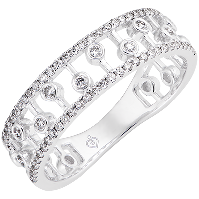 Een ring met geweven diamantparels, tussen twee bezette ringen. Een origineel, verfijnd model aan de vinger.