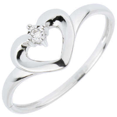 Een rein hart, drager van een solitairee diamant is gezet op een elegante en romantische ring.