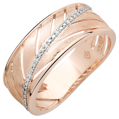 Een grote ring in geborsteld roségoud, heel licht en geïnspireerd door het palmblad. De hoofdnerf wordt versierd met een rij diamantjes. Een ring om alle dagen te dragen of bij belangrijke gebeurtenissen.