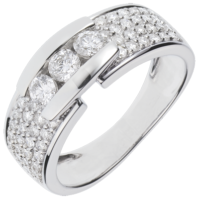 Een trilogie van diamanten rijkelijk geplaveid op een witgouden ring.