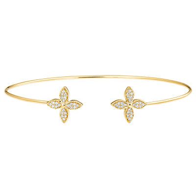 Een elegante geelgouden armband gesloten met twee klaverblaadjes, ingelegd met glinsterende diamanten. Een tedere, pas ontbloeide geluksbrenger.