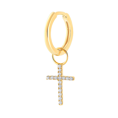 Een enkele geelgouden creole met een kruisvormige bedel en geplaveid met fonkelende diamanten. Afmetingen bedelring: 3.1 mm.