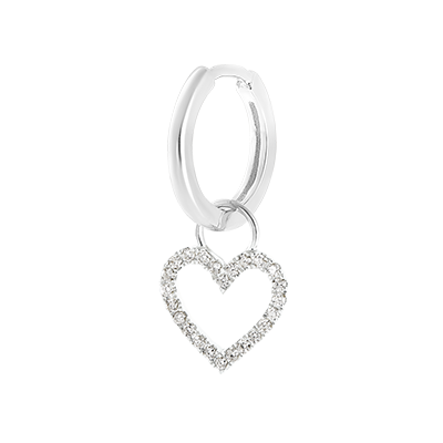 Een enkele witgouden creole met een hartvormige bedel en geplaveid met fonkelende diamanten. Afmetingen bedelring: 3.1 mm.