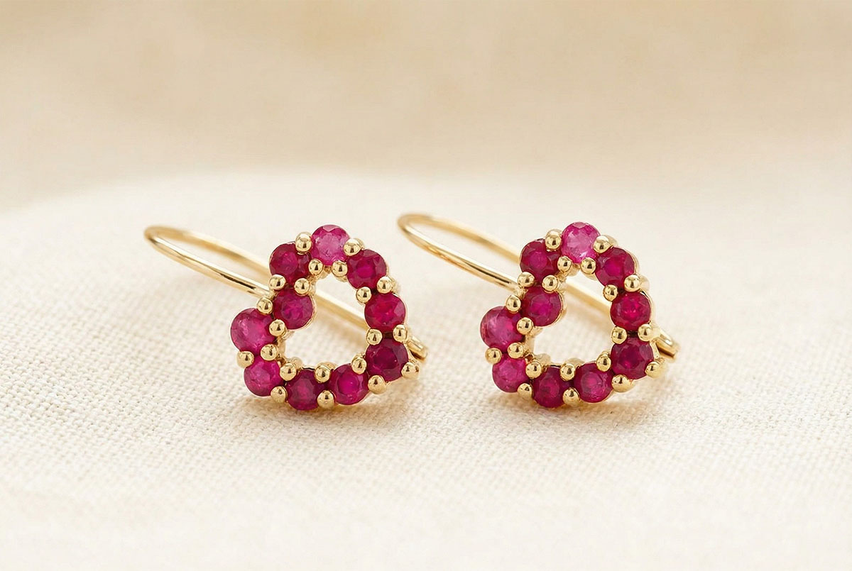 Twee harten gemaakt van waardevolle robijnen en geelgoud zijn de perfecte bondgenoten van uw vrouwelijkheid.