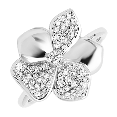 De Cattleya-ring is geïnspireerd op de gelijknamige orchidee, een toonbeeld van elegantie en verfijning. Het florale ontwerp, afwisselend met gladde oppervlakken en een pavé van synthetische diamanten, vangt het licht op subtiele wijze. Een perfect uitgebalanceerd sieraad; even teder als opvallend.