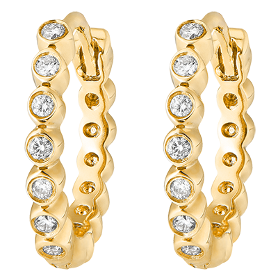 Een cirkel van geelgouden parels bezet met diamanten. Een paar vrouwelijke oorbellen die zowel klassiek als origineel zijn.