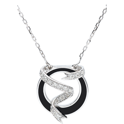 Een gouden cirkel gevuld met zwarte lak wordt doorkruist door een delicaat witgouden lint, rijkelijk geplaveid met diamanten. De pure elegantie.