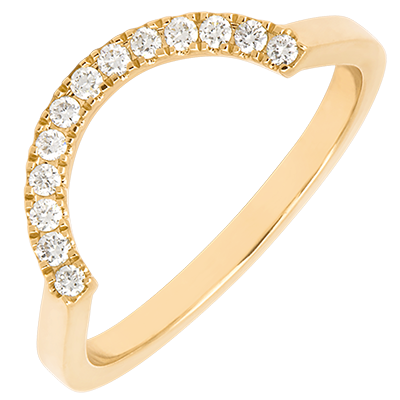 De Contour-ring met diamanten voegt een extra vleugje schittering toe aan het Romance Moderne-trio. Gemaakt van gepolijst goud, wordt de elegante curve verlicht door een pavé van fonkelende diamanten die de vorm van de centrale ring subtiel benadrukken. Solo gedragen of gecombineerd met de Contour-ring en de Cabochon Aura Nacrée-ring, onthult het de volle rijkdom van een moderne en verfijnde stijl.