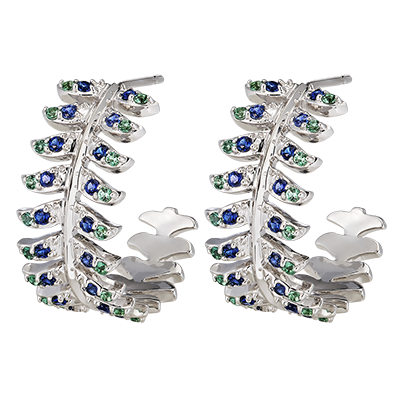 De eerbied hoepeloorringen in 9 karaats witgoud onderscheiden zich door hun cirkelvormige veermotief, subtiel bezet met 72 synthetische smaragden en saffieren. Deze hoepels vangen het licht gracieus op en geven een spectaculaire toets aan elke outfit, terwijl ze de majestueuze geest van de Panache collectie weerspiegelen.