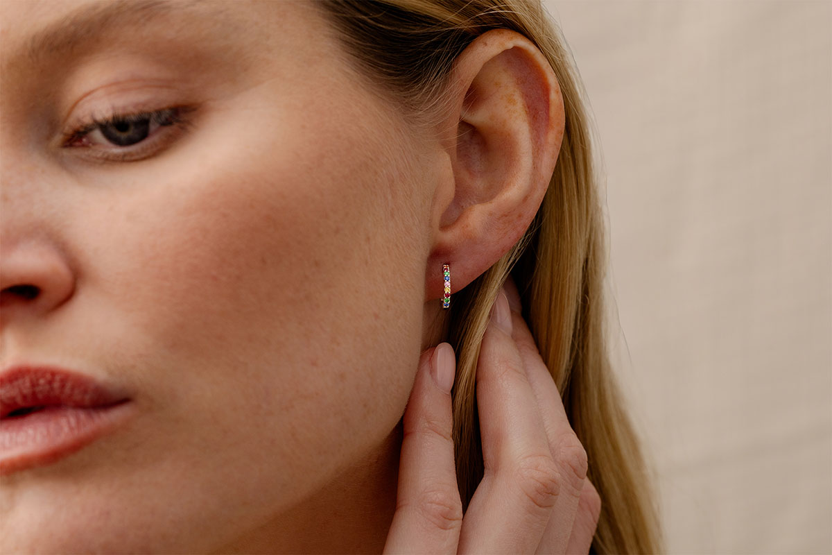 In dit paar oorbellen vindt men een regenboog van kleuren, vervraaid met witgoud en edelstenen. Ze zijn versierd met oranje en rode robijn, smaragd en blauwe, roze en gele saffieren.
