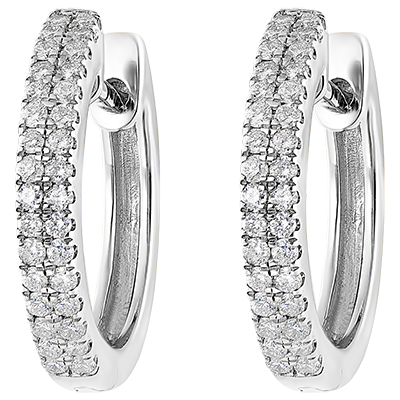 Een paar semi-pavé witgouden oorbellen met een dubbele rij diamanten voor lichtheid en elegantie.