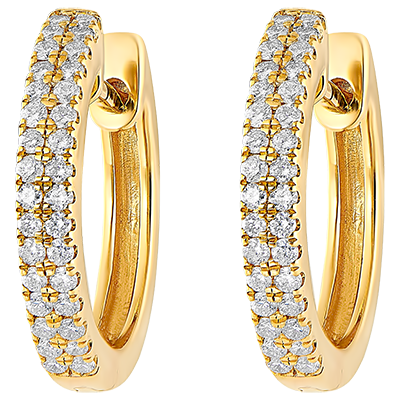 Een paar semi-pavé geelgouden oorbellen met een dubbele rij diamanten voor lichtheid en elegantie.