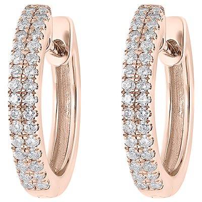 Een paar semi-pavé roségouden oorbellen met een dubbele rij diamanten voor lichtheid en elegantie.