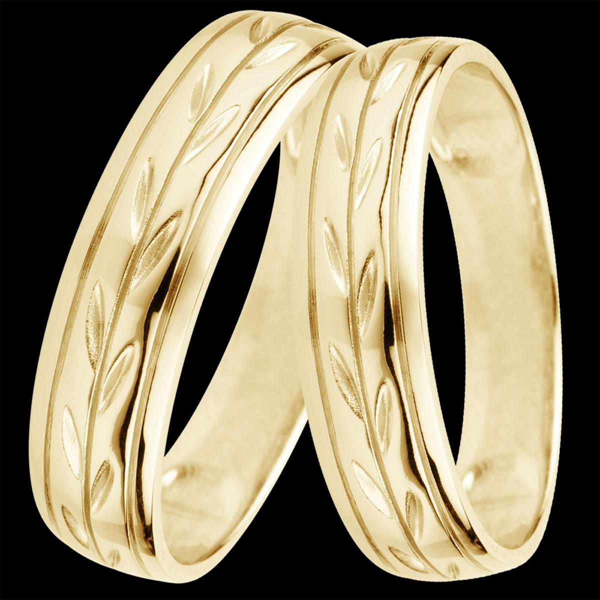 Een elegant paar trouwringen van geelgoud, subtiel gegraveerd met een tijdloos bladerpatroon. Een stijlvolle keuze voor eeuwige liefde van Edenly.