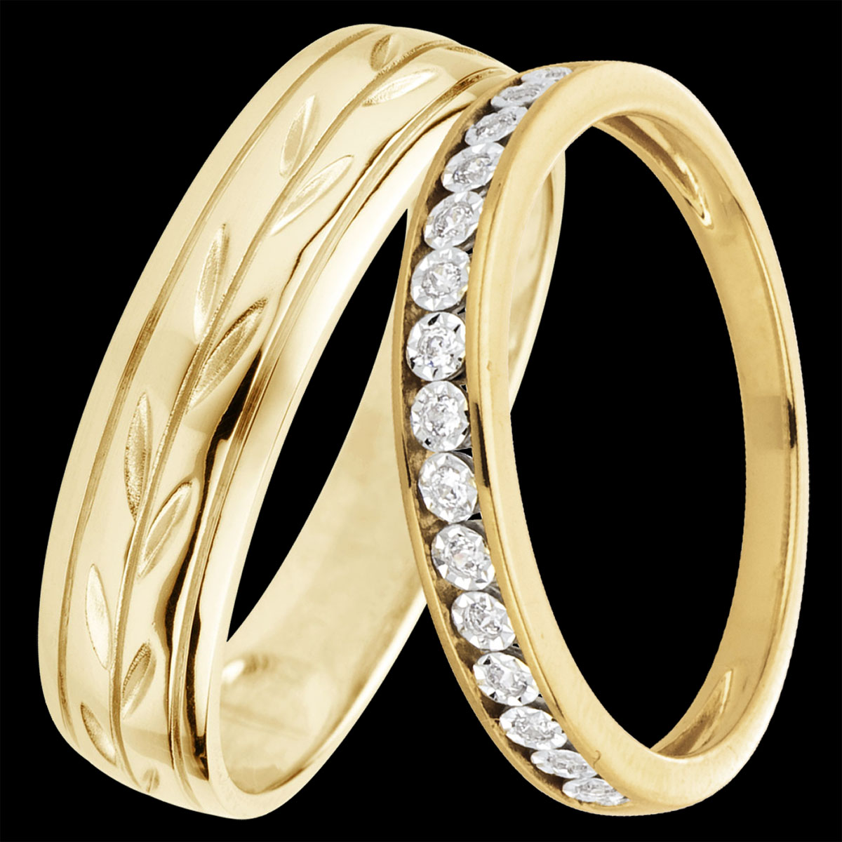 Een elegant paar trouwringen voor haar & hem. Voor haar: een geelgouden ring met een witgouden zetting en schitterende diamanten. Voor hem: een brede geelgouden ring met een eeuwig bladerpatroon.