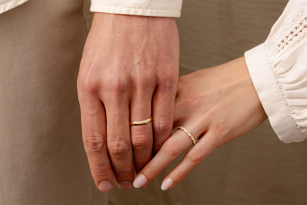 Een elegant paar trouwringen voor haar & hem. Voor haar, twee geelgouden banden volledig bezet met diamanten; voor hem, een gepolijste geelgouden ring van 3,5 mm breed. Samensmelting van klasse en schittering.