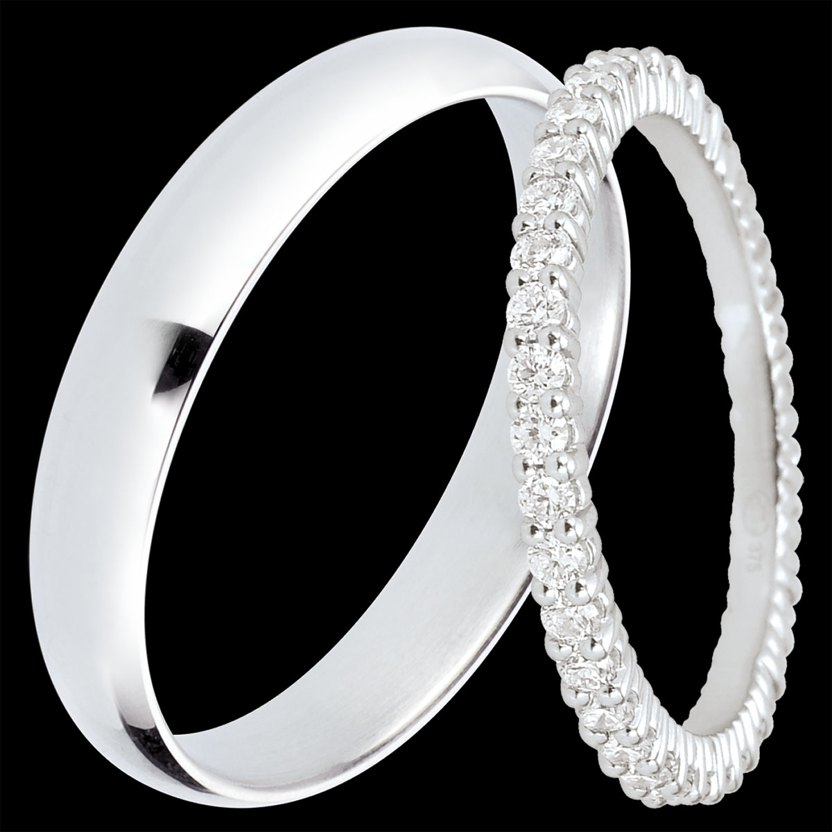 Een elegant paar trouwringen voor haar & hem. Een volledig bezette ring met 38 griffenzet diamanten, samen 0,57 karaat, voor haar; een gepolijste witgouden band van 4 mm voor hem. Pure elegantie voor een bijzondere verbintenis.