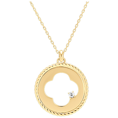Een elegante ketting met als centraal motief een rond geelgouden token, subtiel versierd met een gedraaide rand. Daarin zit een geslepen klavertje bezet met een sprankelende diamant voor absolute schittering.