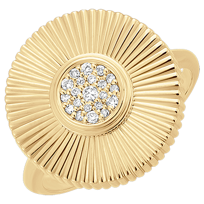 Een geelgouden ring, die met zijn stralende ontwerp de zon oproept en in het midden wordt verlicht door een cluster van gezette diamanten. Een moderne interpretatie van weelde, perfect om licht uit te stralen in elke dagelijkse outfit.