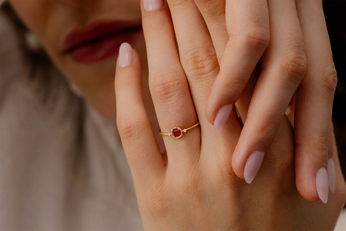 Garance Ring – 9 karaat geelgoud, robijn en synthetische diamanten