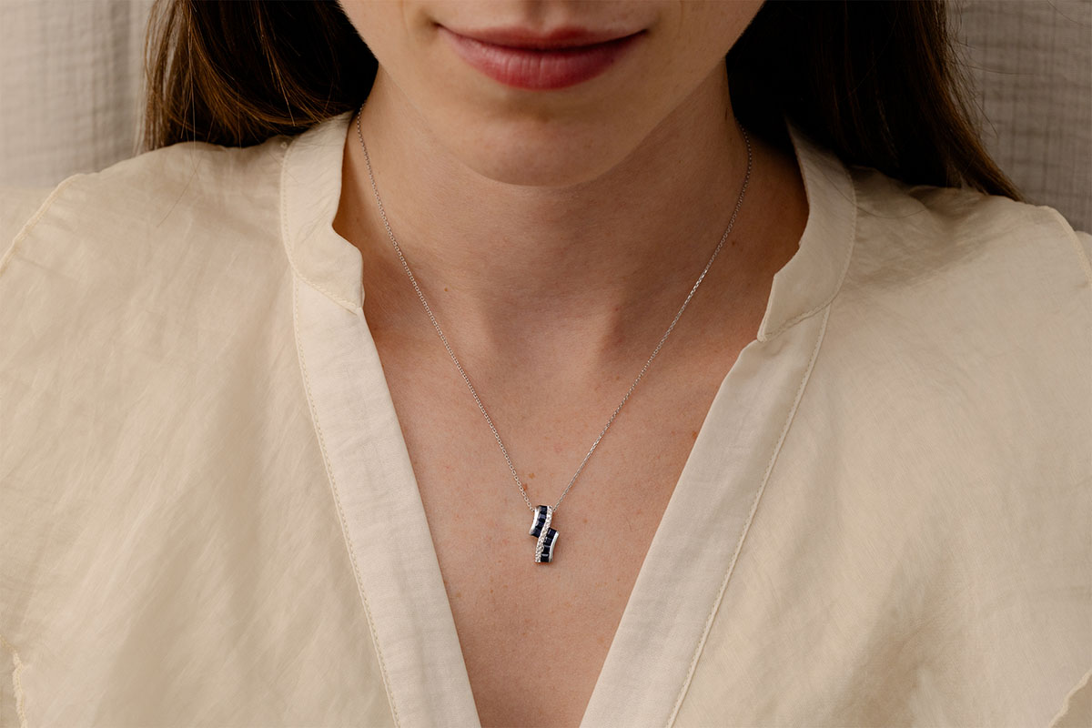 Een ketting met vrouwelijke en elegante bogen gewijd aan een Saffier en diamant met verfijning.