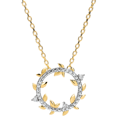 Afwisselend blad geelgoud en schitterende geborstelde bladeren voor een romantische ketting bezet met 6 diamanten.