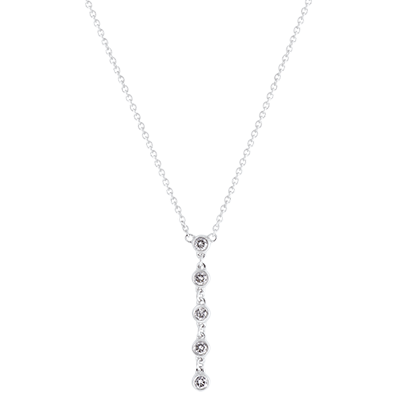 5 schitterende diamanten druppels op een rij, bevestigd aan een fijne halsketting. Een sober icoon, tijdloos, voor een pure en eenduidige boodschap. Met ketting met dubbele positie 42cm en 45cm.