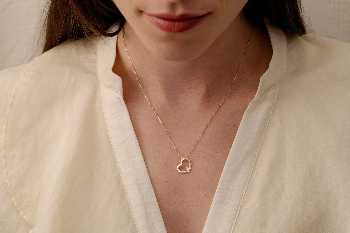 Een tweekleurig hart met moderne bogen, met in zijn centrum een diamant omringd door witgoud.