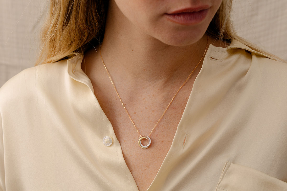 De uitgebalanceerde combinatie van de drie goudkleuren: wit, geel en roze, geaccentueerd door een diamanten pavézetting voor een unieke en tijdloze combinatie.