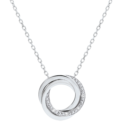 De uitgebalanceerde combinatie van drie ringen, gemarkeerd door diamanten op witgoud zorgt voor een unieke halsketting.